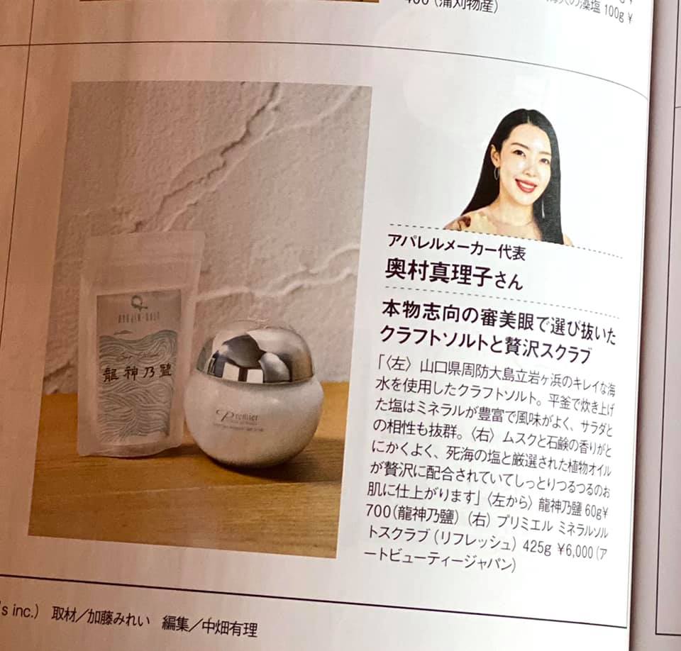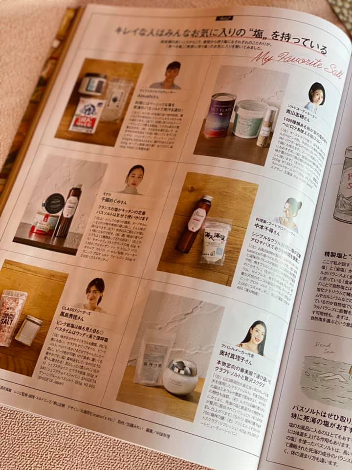 12月28日発売の雑誌CLASSY.にて龍神乃鹽が紹介されました。ファッションブランド「nostalgia」を運営、美容の世界でも広く活躍をされている奥村真理子さんに「お気に入りの塩」として龍神乃鹽をご紹介して頂きました。また、ソルトコーディネーターの青山志穂さんがセレクトされた塩も紹介されており、東京戸越銀座にある塩専門店solcoさんの取り扱い商品も紹介をされております。塩専門店solcoさんには店舗専用のボトルにて龍神乃鹽のお取り扱いを頂いております。
