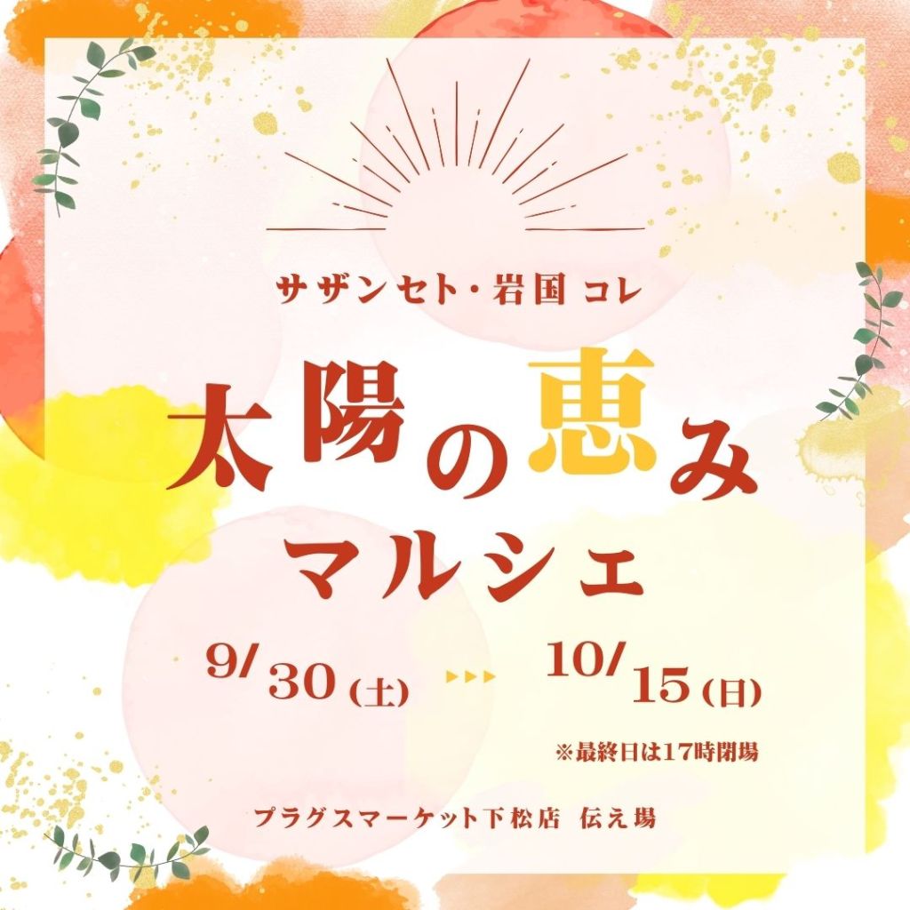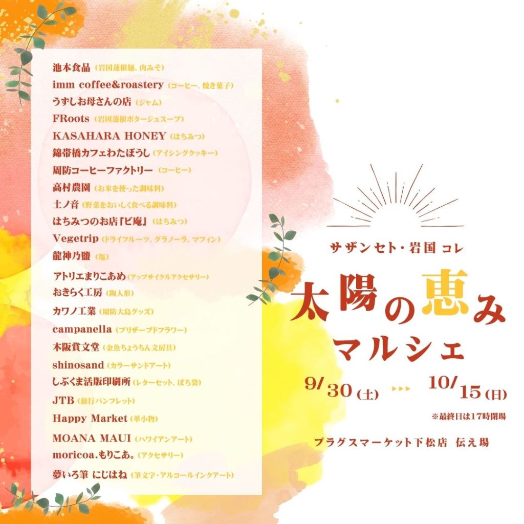 「サザンセト・岩国コレ 太陽の恵みマルシェ」のお知らせ 投稿者: ryujin-salt 投稿日: 2023年10月4日2023年10月4日 周防大島、岩国、柳井の特産品や雑貨が集まる「サザンセト・岩国コレ 太陽の恵みマルシェ」に龍神乃鹽、凪塩も出展しています。場所はゆめタウン下松3階の”プラグスマーケット下松店 伝え場”期間は10/15日曜日までです。よろしくお願い致します。 共有: X で共有 (新しいウィンドウで開きます) X Facebook で共有 (新しいウィンドウで開きます) Facebook いいね 読み込み中…