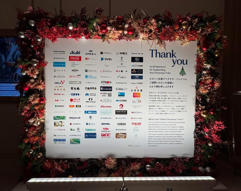 私たち「龍神乃鹽」もヒルトン広島「日本料理 泉水」の「鉄板焼 渾」で龍神乃鹽を使っていただいてる関係もあり、今回このチャリティー・プロジェクト「ヒルトン広島 クリスマストレイン」に多少の寄付をさせていただき、この企画のお仲間に入れていただきました。